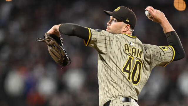 Il lanciatore di San Diego Padres Jason Adam (40) lancia contro i San Francisco Giants nel settimo inning all’Oracle Park. (Immagini Eakin Howard-Imagn)