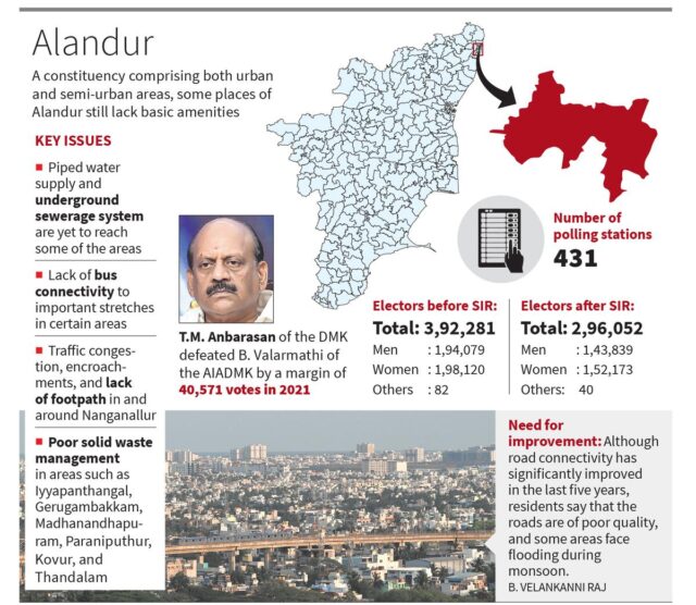 L’ex primo ministro e fondatore del partito AIADMK MG Ramachandran ha intrapreso la sua carriera politica dal collegio elettorale “Parangimalai” che è stato successivamente fuso con Alandur. L’space che lo ha votato al potere, in seguito ha oscillato avanti e indietro tra i due principali partiti dravidici, ed è stata una roccaforte del DMK negli ultimi dieci anni.