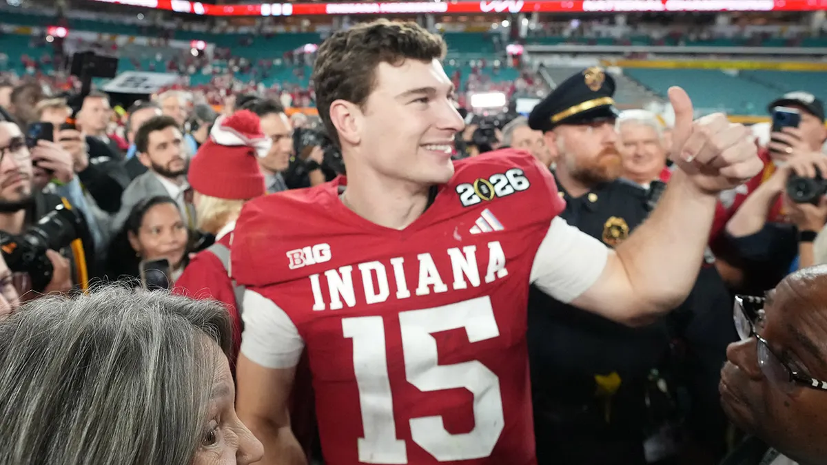 Fernando Mendoza degli Indiana Hoosiers festeggia dopo aver sconfitto i Miami Hurricanes 27-21 nel campionato nazionale playoff del School Soccer 2026 all’Arduous Rock Stadium di Miami Gardens, Florida, il 19 gennaio 2026. (Megan Briggs/Getty Pictures)