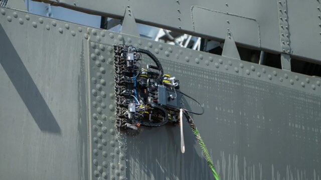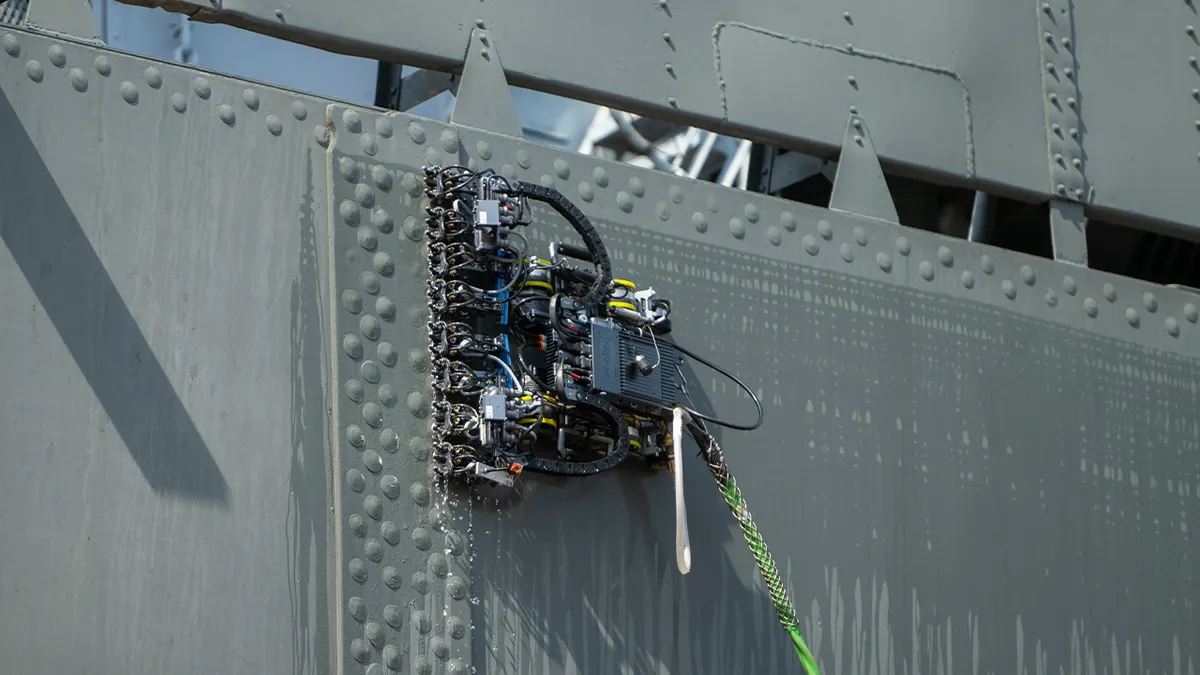 Le macchine basate sull’intelligenza artificiale, sviluppate da Gecko Robotics con sede a Pittsburgh, scalano scafi, ponti di volo e altre superfici in acciaio difficili da raggiungere, rilevando corrosione, fatica del metallo e difetti di saldatura.