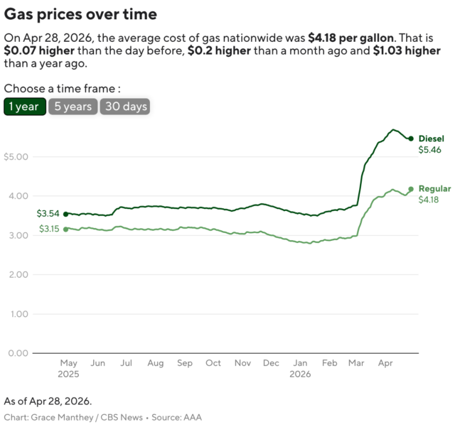 Martedì, il costo medio di un litro di benzina ha raggiunto i 4,18 dollari AAAil livello più alto dal guerra in Medio Oriente iniziò.