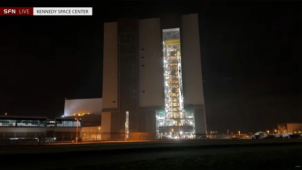 Montato su un potente trasportatore cingolato dell’period Apollo, il razzo Artemis II House Launch System, alto 332 piedi, e la sua piattaforma di lancio cellular hanno iniziato advert uscire dal Car Meeting Constructing della NASA intorno alle 00:20 EDT, con quasi quattro ore e mezza di ritardo a causa dei forti venti lungo la costa spaziale della Florida.