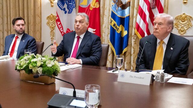 Il primo ministro ungherese Viktor Orban (al centro) parla mentre il vicepresidente degli Stati Uniti JD Vance (a sinistra) e il presidente Donald Trump (a destra) osservano durante un incontro nella Cupboard Room della Casa Bianca a Washington, DC, il 7 novembre 2025. (SAUL LOEB/AFP tramite Getty Photos)