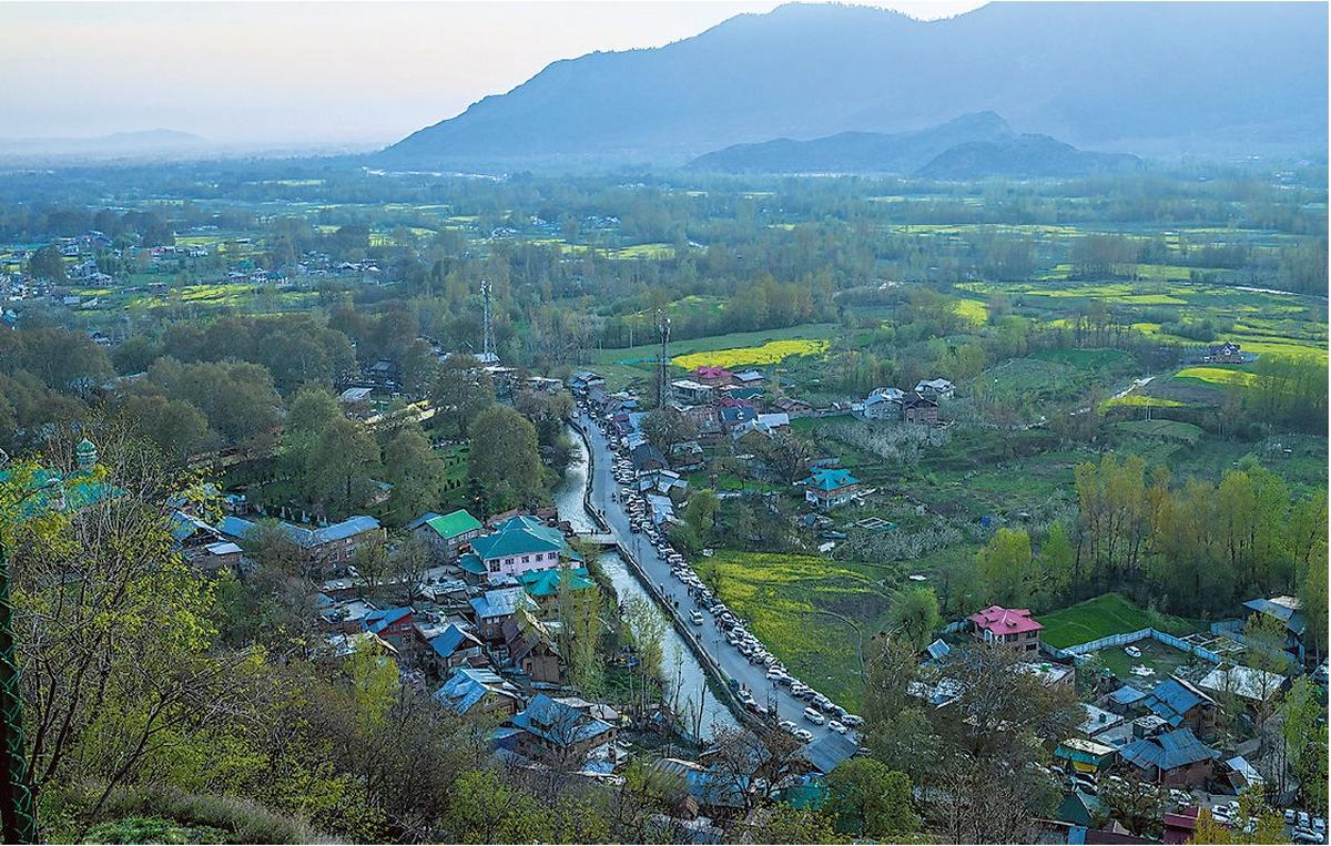 Vista sulla valle: uno sguardo dalla cima del santuario mostra una parte della località di Aishmuqam con i suoi campi di senape.