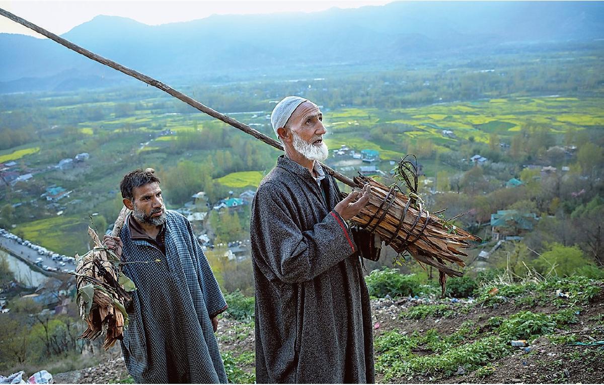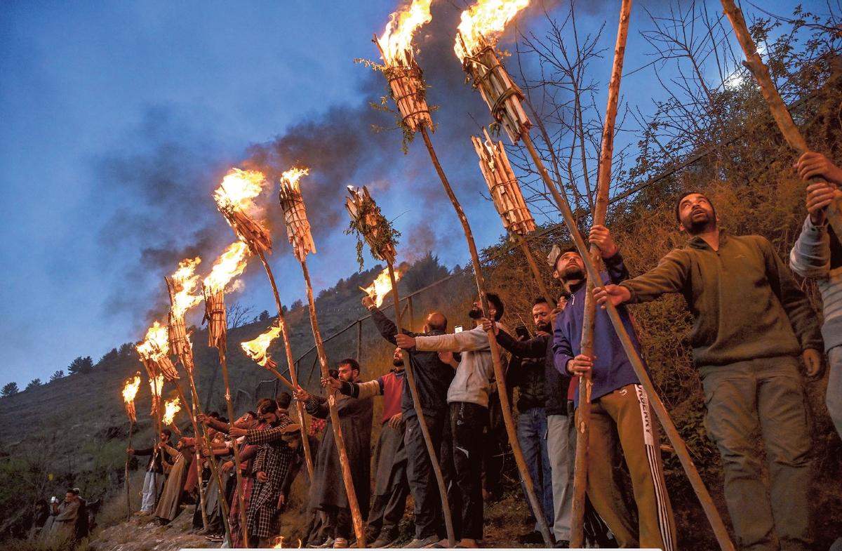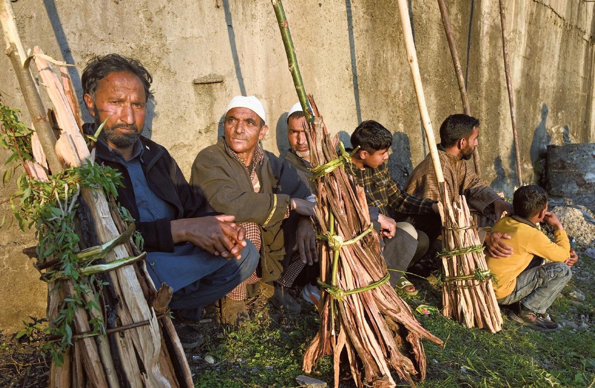 Pronti per il rituale: i musulmani del Kashmir si siedono con fasci di legna da accendere la sera fuori dal santuario durante l’annuale competition delle torce advert Aishmuqam, 75 km a sud di Srinagar.