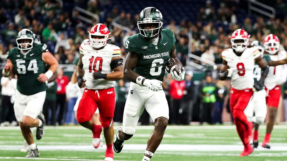 Nick Marsh (6) dei Michigan State Spartans lancia la palla sul campo durante il primo quarto di una partita contro i Maryland Terrapins al Ford Discipline il 29 novembre 2025 a Detroit. (Mike Mulholland/Getty Pictures)