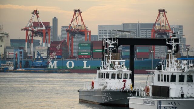 Una nave portacontainer della Mitsui OSK Strains (MOL) in un terminal di Tokyo il 31 ottobre 2016.
