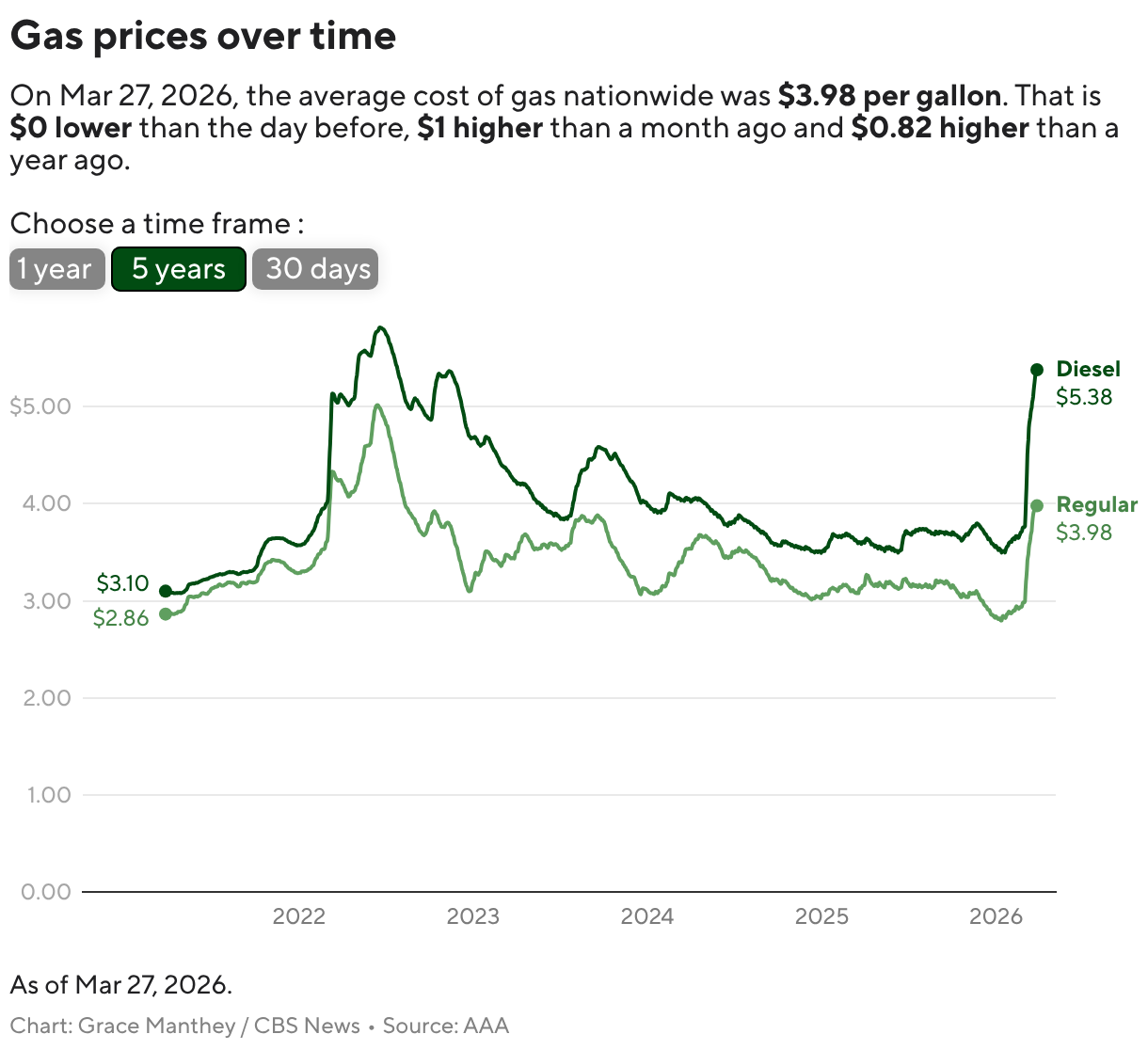Secondo i dati di venerdì, il prezzo medio nazionale del fuel negli Stati Uniti period di 3,98 dollari al gallone, in aumento di un dollaro rispetto a un mese fa. AAA. Il costo del diesel, ampiamente utilizzato nell’agricoltura, negli autotrasporti e nell’edilizia, tra gli altri settori, è aumentato ancora di più e ora ammonta a 5,37 dollari al gallone, contro i 3,75 dollari di un mese fa.