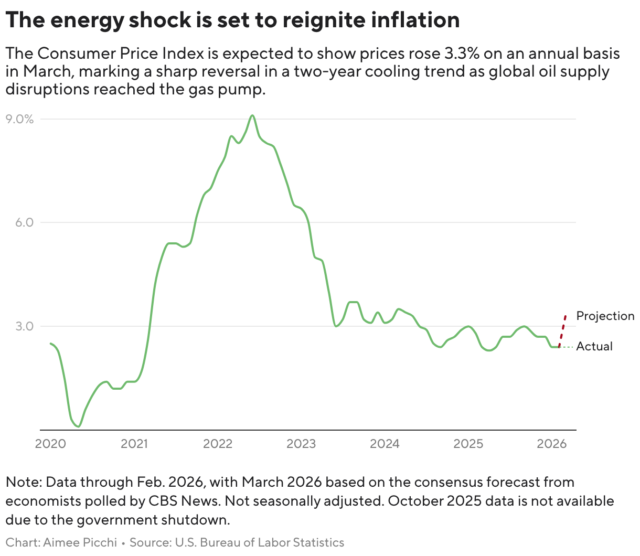 L’atteso aumento dell’indice dei prezzi al consumo arriva dopo che l’inflazione si è raffreddata a a Tasso annuo del 2,4%. nei primi due mesi del 2026, ancora al di sopra dell’obiettivo del 2% della Federal Reserve, ma molto al di sotto del massimo quarantennale del 9,1% registrato nel giugno 2022.