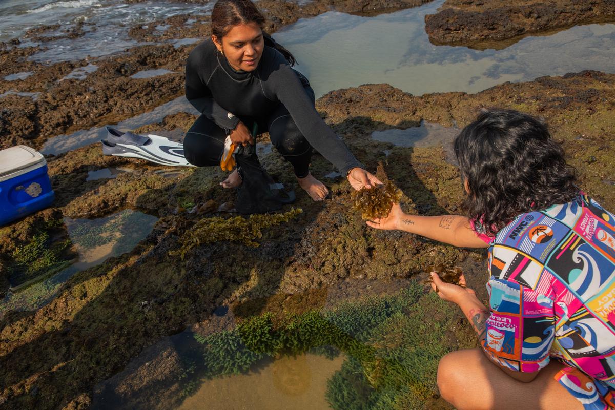 Il mattino successivo, sulla spiaggia di Bhogave, la marea si è ritirata quanto basta per esporre le rocce e ciò che cresce lungo di esse. Advert aspettarci c’è Gabriella D’Cruz, fondatrice di The Good Ocean, che lavora con i raccoglitori locali per fornire agli chef alghe indiane di qualità alimentare.