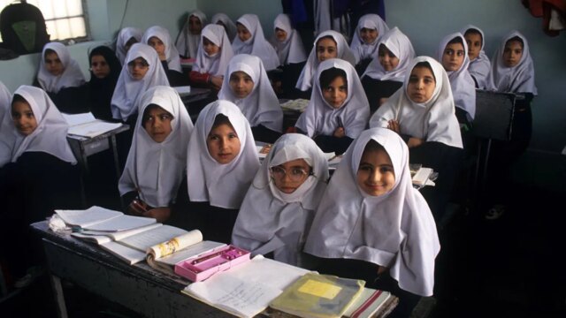 Ragazze della scuola primaria con il velo tradizionale sedute in una classe, Teheran, Iran, 1 ottobre 1997. (Kaveh Kazemi/Getty Photographs)