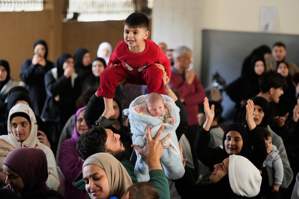 Uomini sollevano due bambini durante un evento in cui i volontari hanno preparato pacchi di cibo e dolciumi per le famiglie sfollate che celebravano la festività lontano dalle loro case, in un’università pubblica trasformata in un rifugio dopo gli attacchi aerei israeliani a Beirut, in Libano, il 20 marzo 2026.
