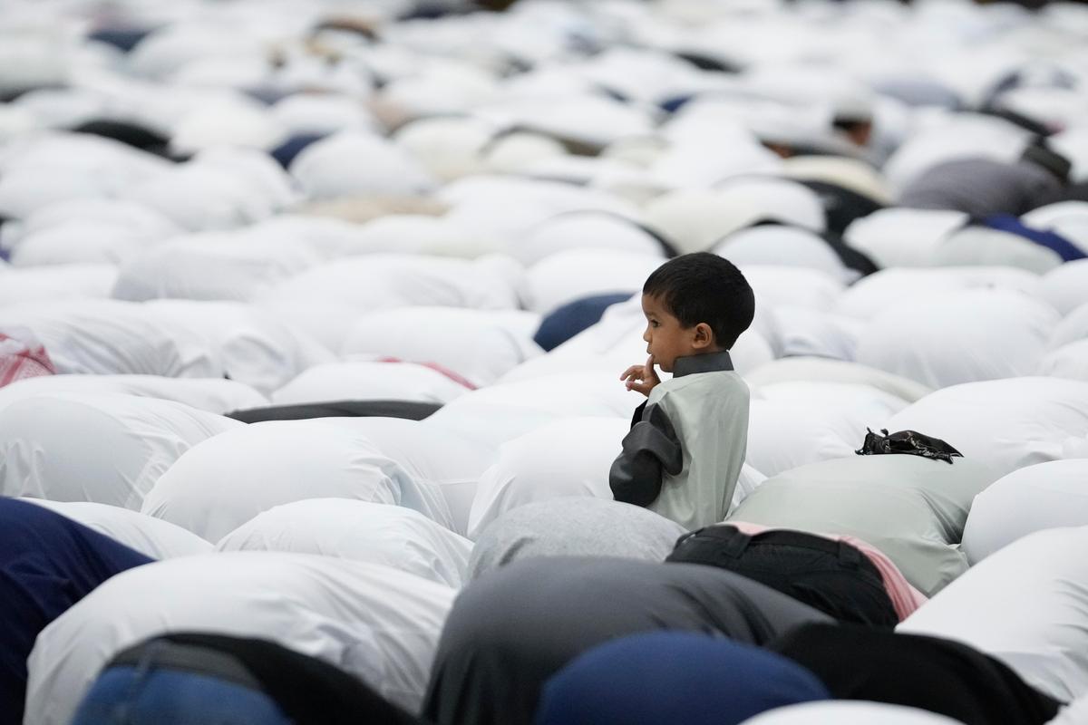 Un bambino guarda mentre le persone eseguono Id-ul-Fitr, segnando la high quality del mese sacro musulmano del Ramadan al Panama Conference Heart, a Panama Metropolis, il 20 marzo 2026.