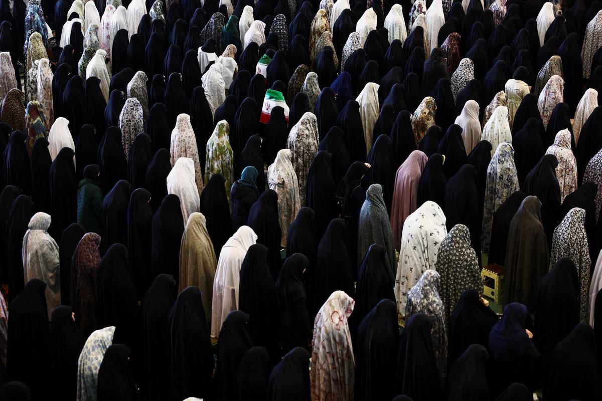 Persone partecipano alle preghiere dell’Id-ul-Fitr a Teheran, Iran, il 21 marzo 2026. All’alba, una folla di fedeli si è radunata nella grande moschea dell’Imam Khomeini nel centro di Teheran, che prende il nome dal fondatore della repubblica islamica. Foto: WANA (Agenzia di stampa dell’Asia occidentale) tramite Reuters