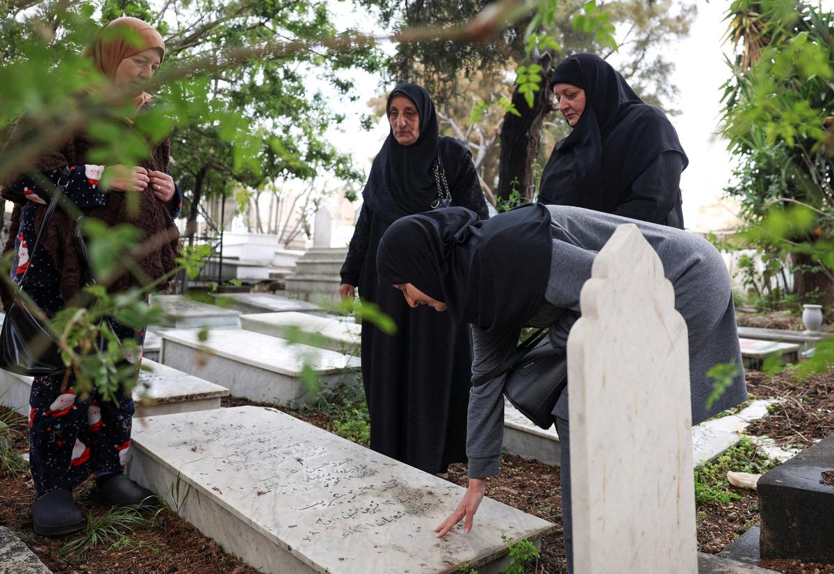 Donne sfollate dal Libano meridionale pregano accanto a una tomba in un cimitero sciita, il giorno dell’Eid al-Fitr, a seguito di un’escalation tra Hezbollah e Israele nel conflitto USA-Israele con l’Iran, a Sidone, in Libano, il 20 marzo 2026.