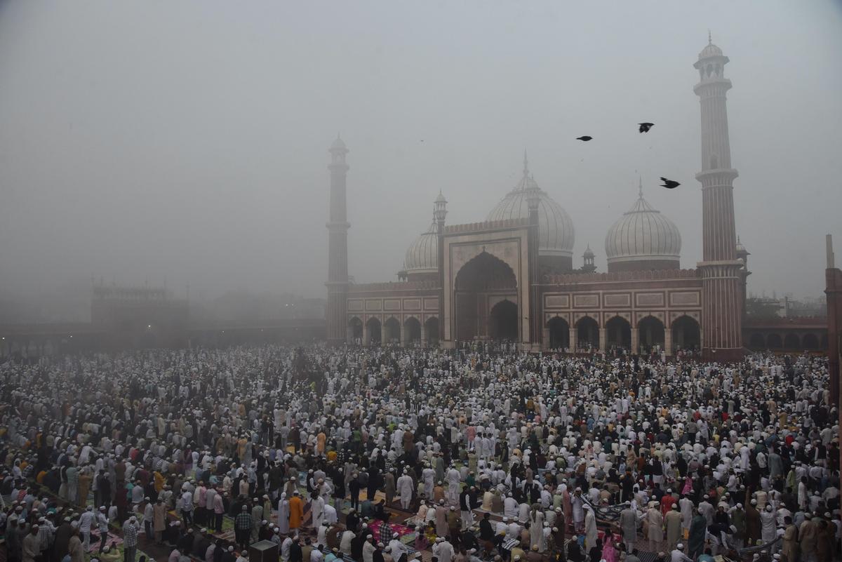 Devoti musulmani offrono preghiere in mezzo alla nebbia alla Jama Masjid di prima mattina in occasione dell’Id-ul-Fitr, a Nuova Delhi, il 21 marzo 2026.