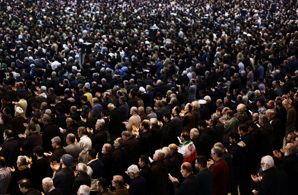 Per mancanza di spazio, molti fedeli hanno seguito la preghiera all’aperto, mentre la televisione di Stato mostrava immagini di zone affollate intorno alla moschea, nonostante il rischio di scioperi. Foto: WANA (Agenzia di stampa dell’Asia occidentale) tramite Reuters