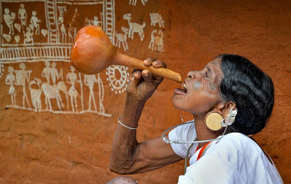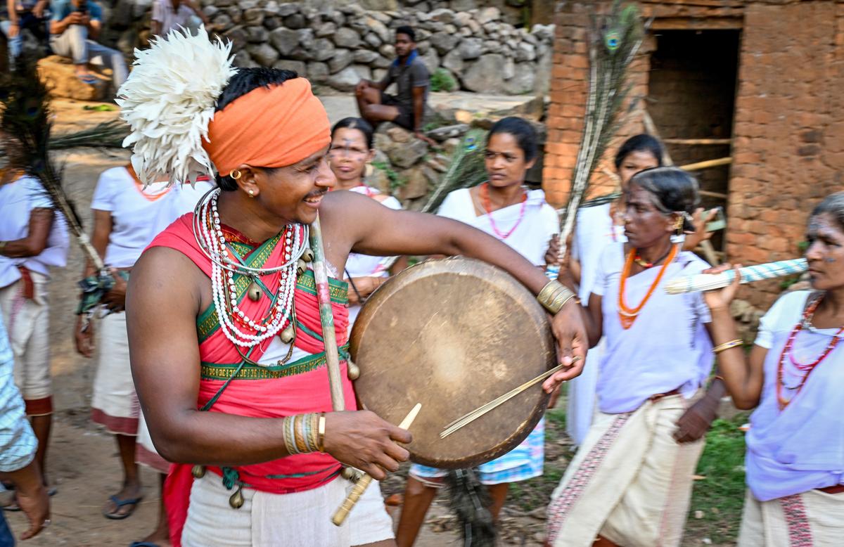 Bei tempi: un uomo Lanjia Saora suona la batteria durante una danza tradizionale in un villaggio nei Ghati orientali della regione di Gunupur, nel distretto di Rayagada, nell’Odisha.