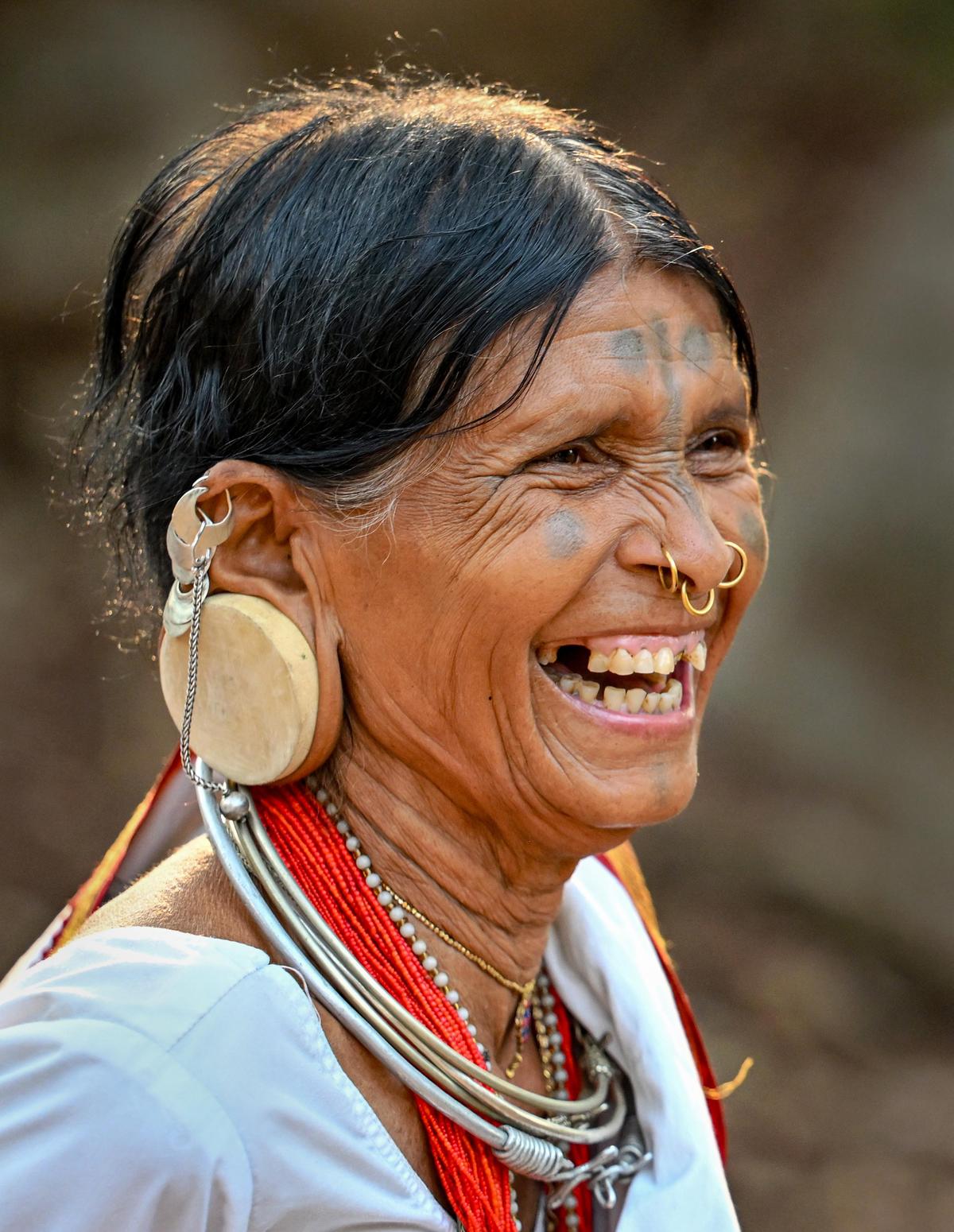 Grazia inchiostrata: una donna Lanjia Saora sorride durante un incontro culturale; i tatuaggi, spesso geometrici o ispirati alla natura, possono essere visti incisi in modo permanente sulla sua pelle.