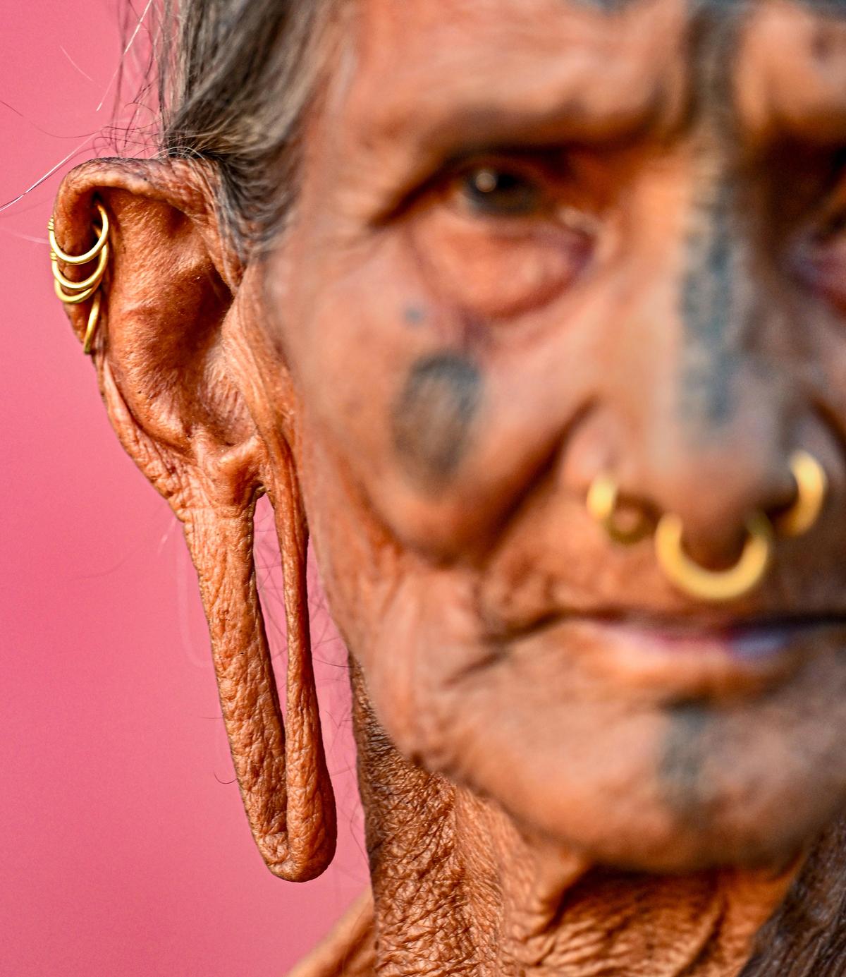 Tra le tradizioni visive più distintive ci sono i grandi orecchini di metallo: spessi ornamenti circolari che non vengono semplicemente indossati ma fissati nei lobi delle orecchie allungati, spesso nel corso degli anni. Per le generazioni più anziane, questi orecchini sono segni di identità e resistenza, il loro peso viene portato con silenzioso orgoglio. I lobi, allungati e modellati dal tempo, parlano di una vita vissuta a stretto ritmo con le usanze ereditate.