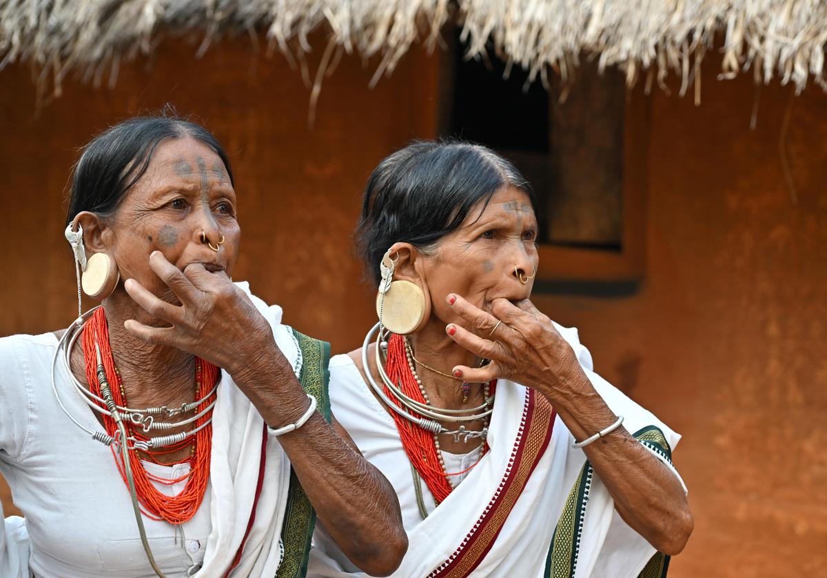 Doppia delizia: le donne Lanjia Saora, adornate con grandi collane di metallo, si vedono esultare durante un evento tradizionale.