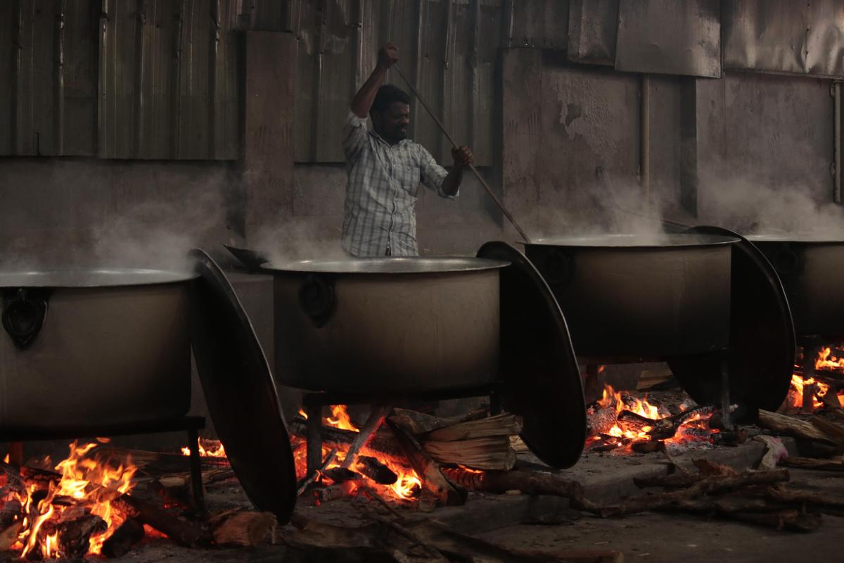 Un altro giorno incontro il quarantasettenne Jafar Sadik nell’ampia cucina del Manacaud Valiyapally Muslim Jama’ath, mentre cucina il piatto in cinque enormi recipienti su legna da ardere. È un’immagine di calma nonostante sia fradicio di sudore e abbia gli occhi lacrimanti. “Ogni giorno sono necessari quasi 100 chilogrammi di riso, ma la quantità può arrivare anche a 150 chilogrammi”, spiega Jafar.