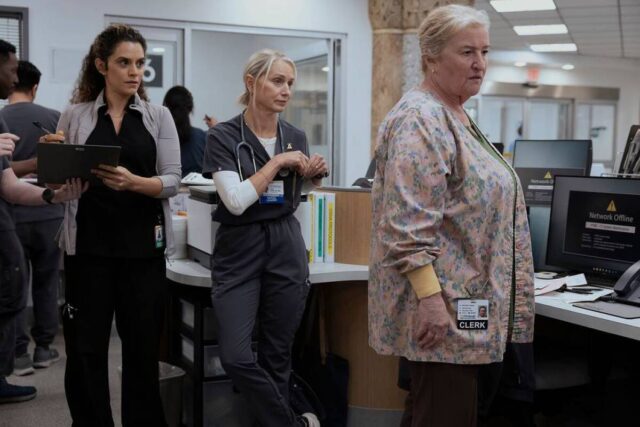 Il risultato è il caos e qualche battuta di troppo sui giovani che non sanno far funzionare un fax o gestire la carta. Alcuni membri del personale più esperto, inclusa e soprattutto l’infaticabile capoinfermiera Dana Evans (Katherine LaNasa), ricordano i giorni prima che tutti portassero un iPad abbastanza bene da tenere le cose in movimento. Anche così, Dana si avvale saggiamente dei servizi dell’impiegata “in pensione” Monica Peters (Rusty Schwimmer).