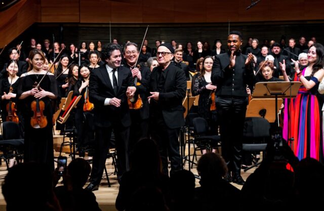 Il direttore Gustavo Dudamel, da sinistra, il compositore David Lang, il basso-baritono Davóne Tines e il mezzosoprano Fleur Barron fanno una chiamata al sipario dopo una prima esecuzione mondiale della New York Philharmonic della “ricchezza delle nazioni” di Lang alla David Geffen Corridor, Lincoln Middle, New York.