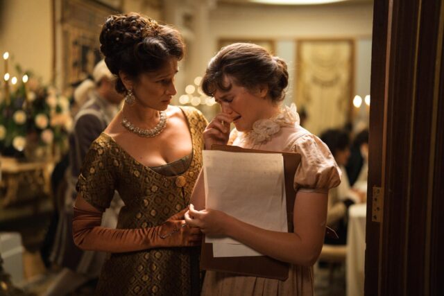 “Volevo molto cercare di mantenere il senso del linguaggio che ho cercato di scrivere nel libro”, aggiunge Hadlow. “Volevo che avesse alcune delle risonanze del modo in cui Austen scrive: il modo in cui si rivolgono a vicenda e la formalità della società. Non volevo che suonasse come se fosse un pastiche, e penso che Sarah lo abbia catturato brillantemente.”