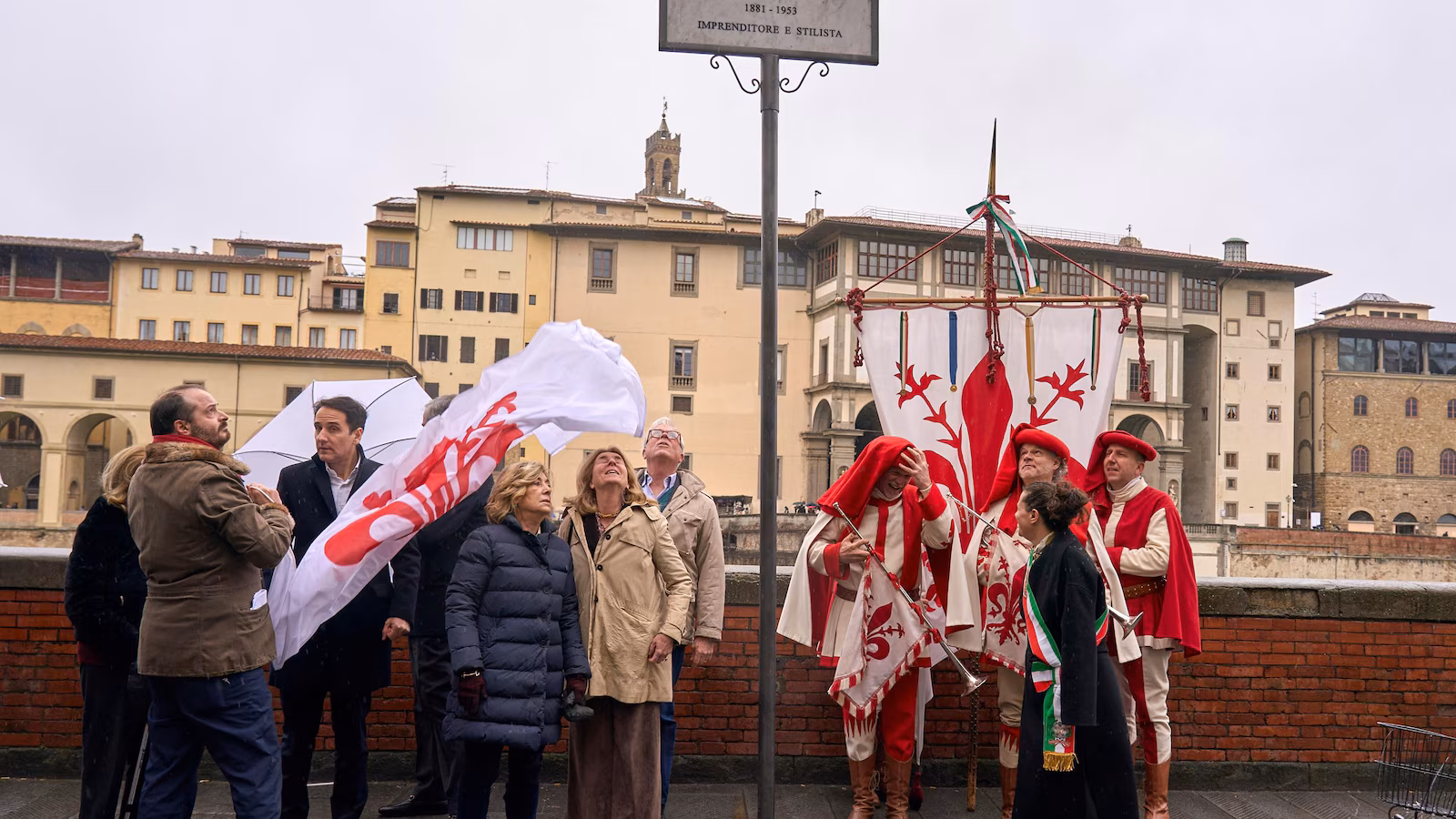 Quattro dei pronipoti di Gucci erano presenti giovedì per la cerimonia di battesimo in piazza, con vista sul famoso Ponte Vecchio e sulla Galleria degli Uffizi, nel 145° anniversario della nascita di Gucci. Erano presenti anche diversi dirigenti ed ex dipendenti di Gucci, tra cui una donna di 88 anni assunta dallo stesso Guccio.
