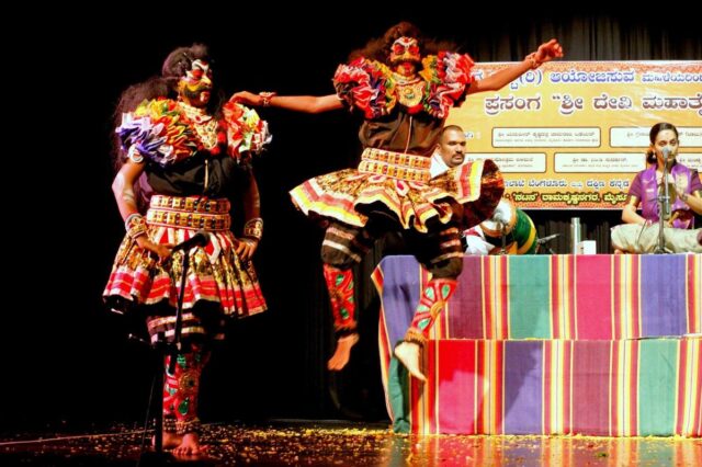 Una scena di “Devi Mahathmeya Chanda Mundaru”, messo in scena a Mysuru da Shri Sai Kala Yaksha Balaga, Dr Shivarama Karantha Balavana Puthur, una troupe guidata principalmente da donne guidata da Prema Kishor. | Credito fotografico: accordo speciale