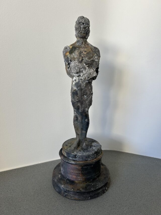 L’Oscar bruciacchiato di Colleen Atwood poco dopo essere stato recuperato dalle macerie della sua ex casa a Palisades.