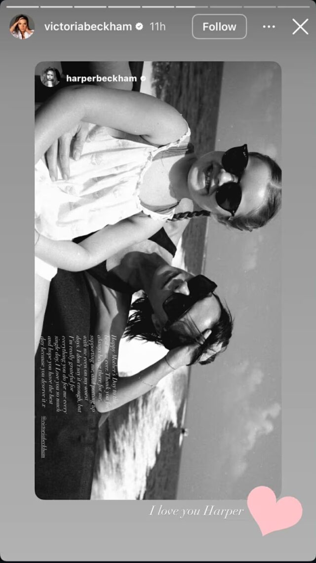 E anche Harper è stata vista rendere omaggio a Victoria. Accanto a una foto in bianco e nero di se stessa e di sua madre, ha scritto sulla sua storia di Instagram: “Buona festa della mamma alla migliore mamma di sempre. Grazie per essere sempre lì per me, supportarmi e sopportarmi anche nei miei giorni peggiori. Non lo dico abbastanza, ma sono davvero grata per tutto quello che fai per me ogni singolo giorno.”