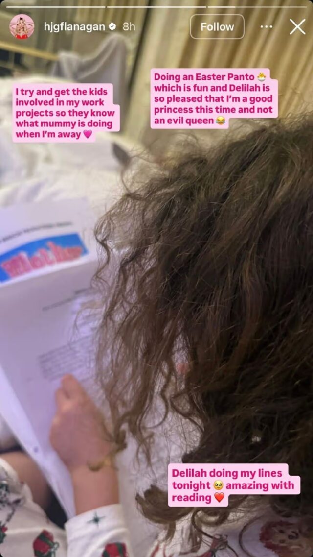 Ha continuato: “Faccio un Panto pasquale che è divertente e Delilah è così contenta che questa volta sono una buona principessa e non una regina cattiva. Delilah fa le mie battute stasera. Incredibile con la lettura.”