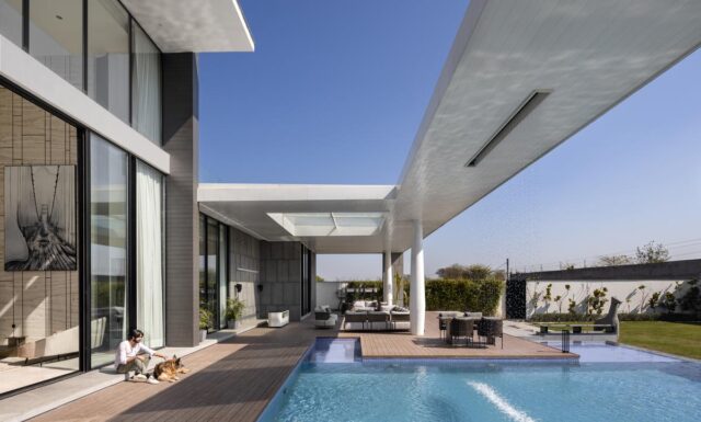 Mohit dirige l’attenzione verso lo schermo al primo piano della facciata. Aggiunge: “Realizzata in legno, si aggiunge al design ma funge anche da elemento architettonico che filtra la dura luce solare del sud-ovest. La villa è stata progettata tenendo presente il clima rigido del Punjab. Il cortile centrale, aperto al cielo, l’space della piscina semi-coperta mantiene la casa naturalmente fresca e ventilata”.