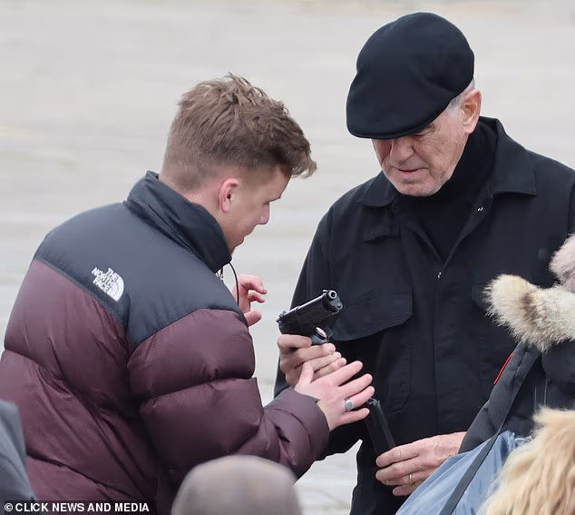 L’attore irlandese, 72 anni, aveva bisogno di aiuto per prendere confidenza con una pistola semiautomatica Glock sul set della seconda serie del movie poliziesco MobLand.