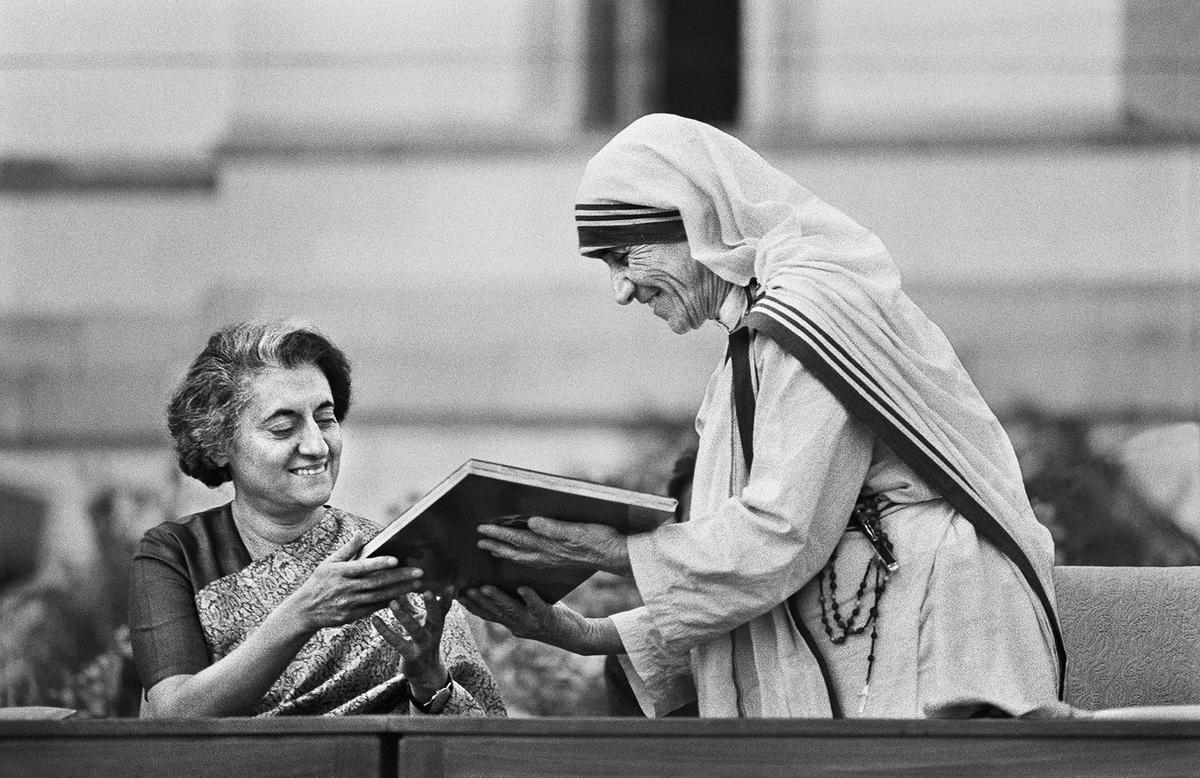 Madre Teresa fotografata con Indira Gandhi dopo aver ricevuto Bharat Ratna a Delhi, nel gennaio 1980.