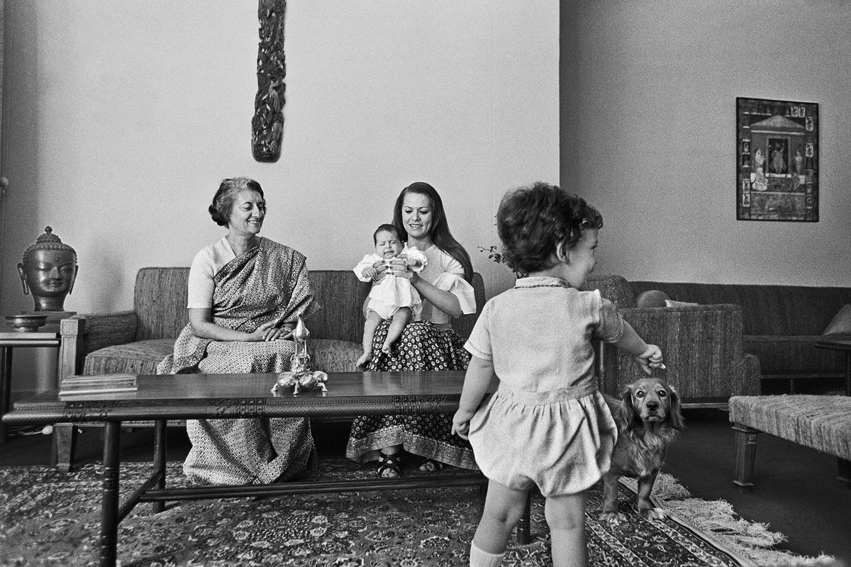Indira Gandhi vista a casa con Sonia Gandhi e i nipoti Rahul e Priyanka. Foto: Raghu Rai e PHOTOINK