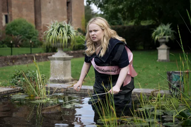 Non solo, ma è anche una “damigella d’onore a un matrimonio elegante”. La suddetta celebrazione si svolge in una tenuta di campagna nel Surrey e si appoggia in modo esilarante all’assurdità dei doveri di un addio al nubilato, vedendo Maggie rimuovere le sanguisughe dalla fontana del parco.