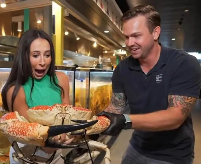Rimase visibilmente scioccata alla vista di un grosso granchio e delle sue enormi chele, ma continuò a tenere il crostaceo arancione.