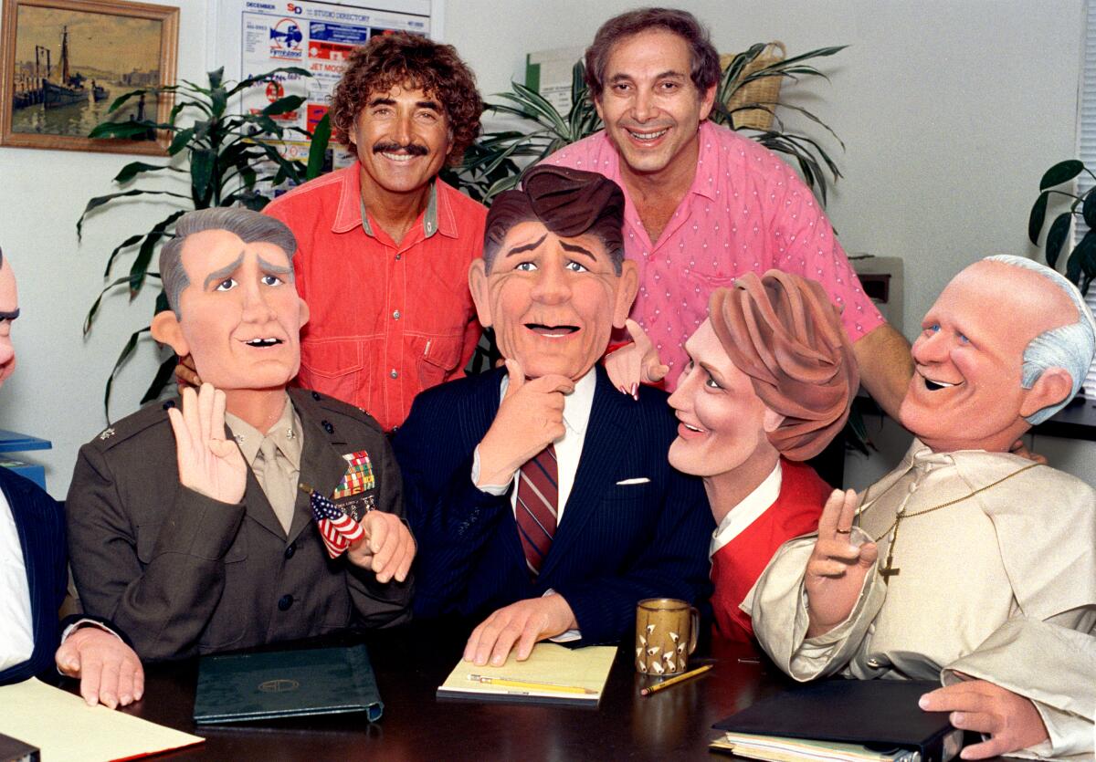 Sid, a sinistra, e il fratello Marty Krofft posano con alcuni dei pupazzi a grandezza naturale creati per la loro serie “DC Follies” a Los Angeles nel 1987.