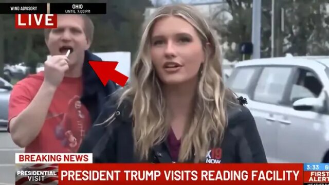 Un video folle sta diventando virale in questo momento di un uomo che sembra masticare una sigaretta in diretta televisiva durante un servizio giornalistico sul Presidente Trumpè la visita dell’Ohio.