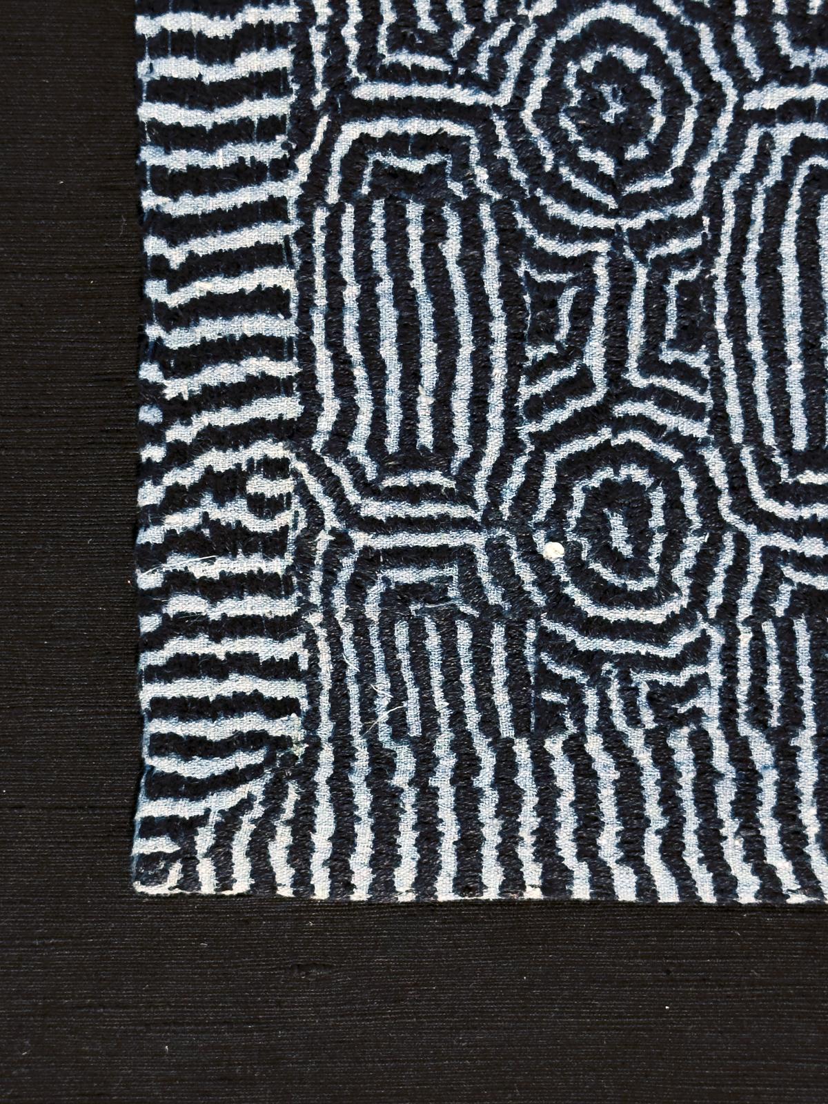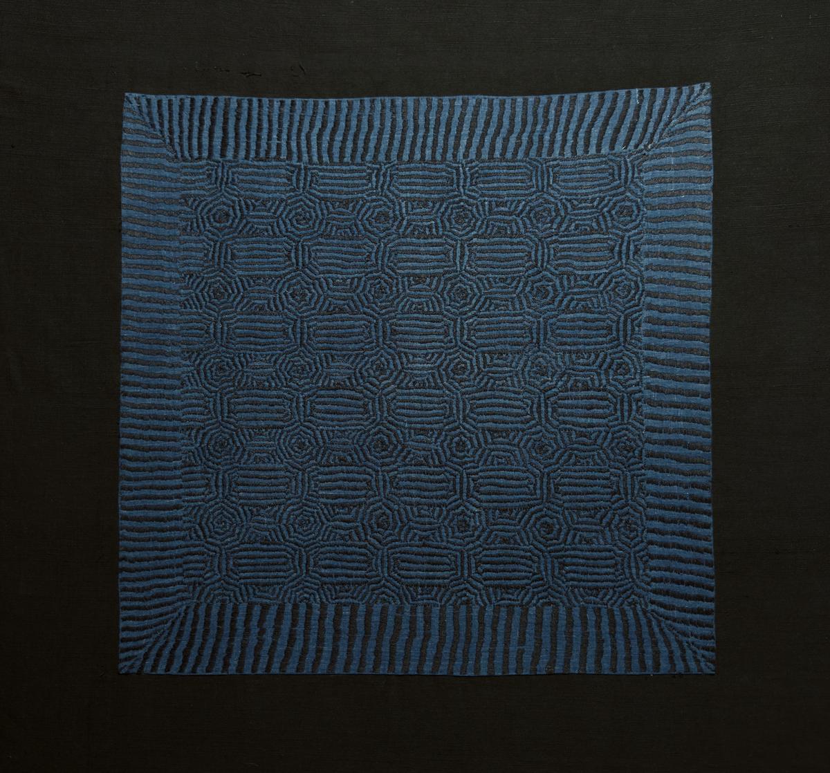 Un’altra opera, Ode to Indigo, si ispira a un tradizionale structure kantha – un motivo di loto simile a un medaglione – reso su un sari jamdani donato, forse vecchio di più di due decenni. I fili tinti in molteplici tonalità di indaco, cresciuti e lavorati da utsaco, creano sottili cambiamenti tonali sulla superficie.