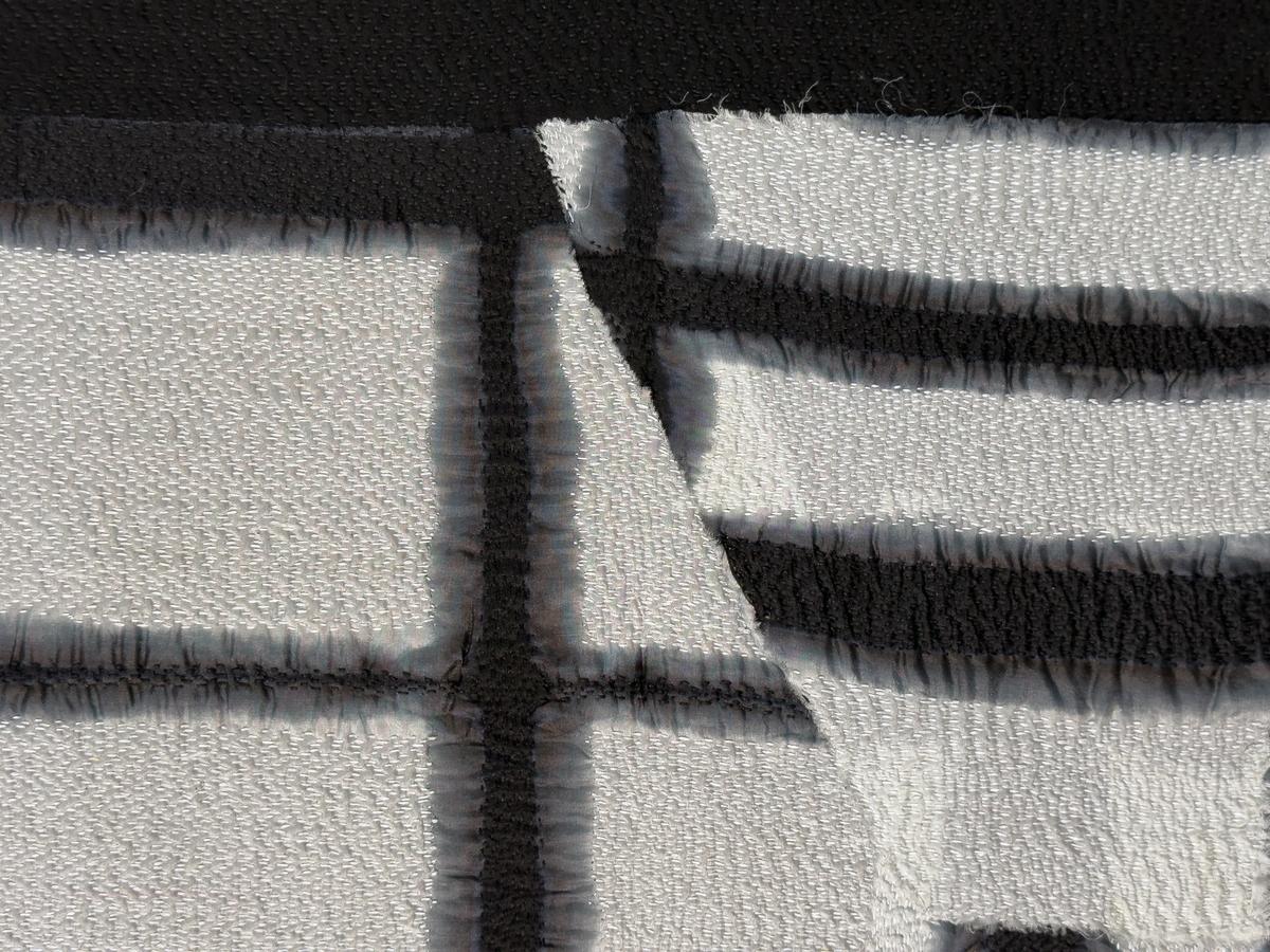 Queste composizioni intuitive sono diventate la base per diversi lavori. In Fragmented, i tessuti patchwork, compresi i ritagli shibori, si uniscono in una tavolozza cruda di nero, bianco e grigio. “L’concept period che il mondo stesso sembra frammentato, così come la nostra visione”, spiega.