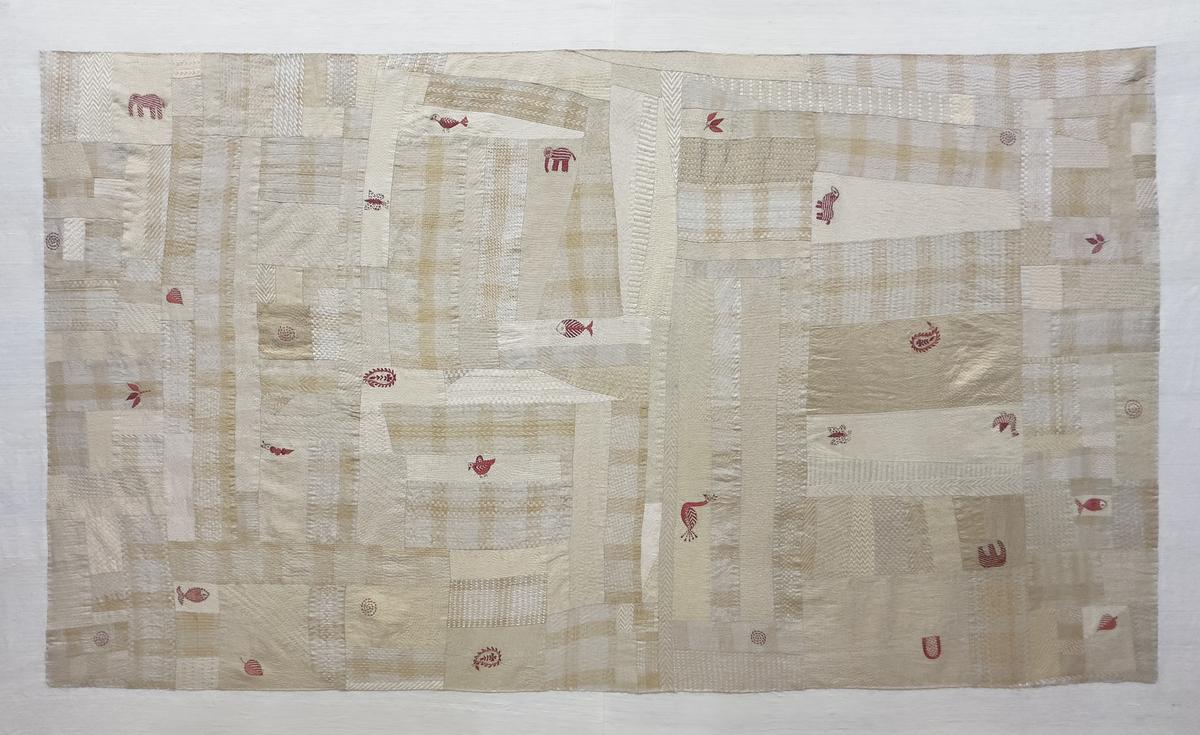 Ciò che lega insieme questi diversi lavori non è un’unica estetica, ma un approccio condiviso. Kantha, qui, è messo in dialogo con altre pratiche globali di riparazione – boro e sashiko giapponesi o pojagi coreano – ciascuna radicata in idee simili di riutilizzo e cura.