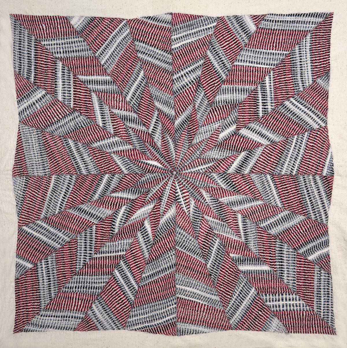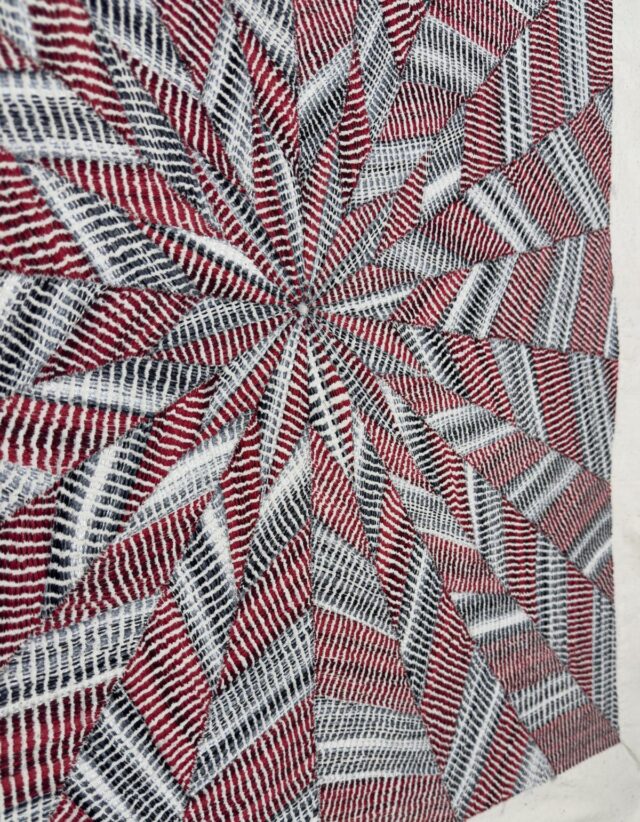 Entrano in gioco anche i contrasti materici. Un’opera utilizza una base bianca con filo di seta muga per ricreare la lucentezza dei tessuti più opulenti. Un altro combina patchwork, trapuntatura e ricamo superficiale per evocare un paesaggio urbano sotto una tempesta in arrivo, facendo sembrare l’arte stratificata, densa e instabile.