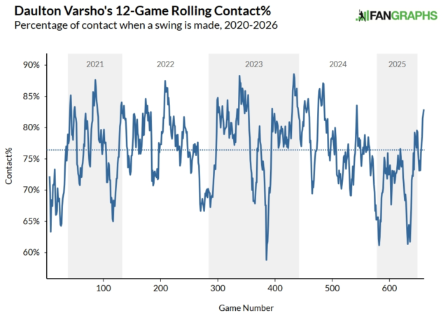 Varsho non ha risvegliato il suo Joey Votto interiore, quindi è improbabile che il picco della velocità di camminata sia duraturo. Il suo tasso di contatto è più alto del solito, ma non fuori posto rispetto alle altre 12 partite della sua carriera: