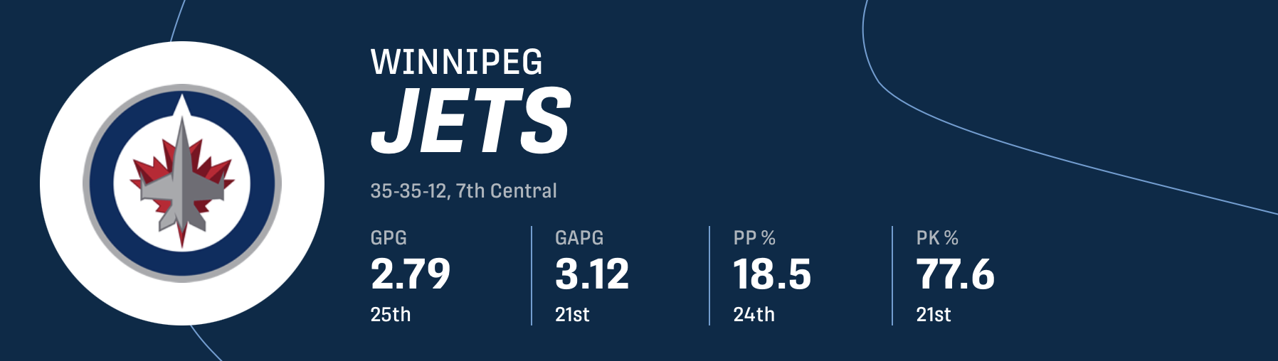 Nel 2024-25, i Jets hanno segnato una media di 3,35 gol a partita, hanno avuto un energy play del 28,9% e un rigore ucciso del 79,4%. In questa stagione, i Jets hanno segnato solo una media di 2,79 gol a partita, un energy play del 18,5% e un rigore eliminato del 77,6%.