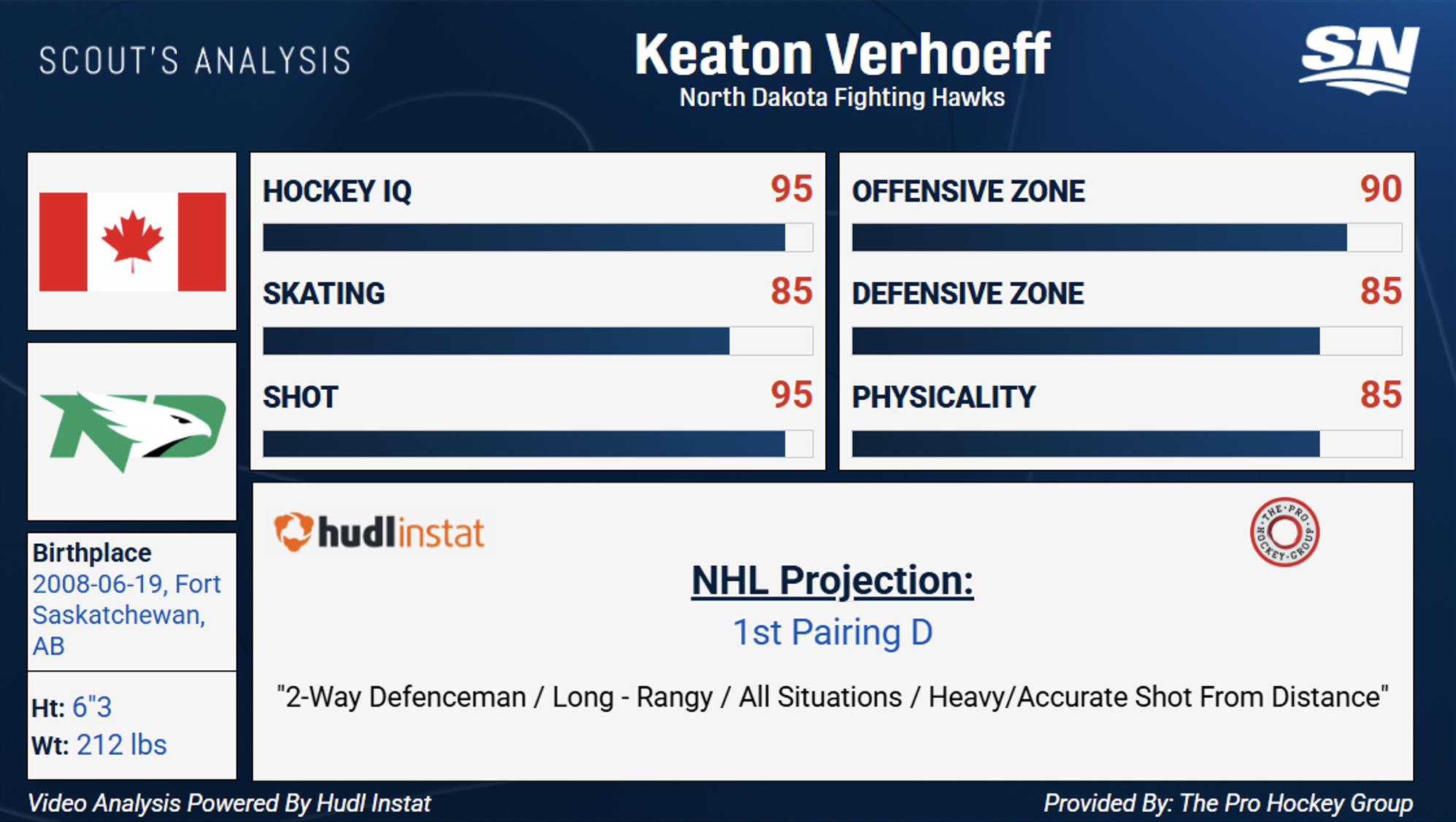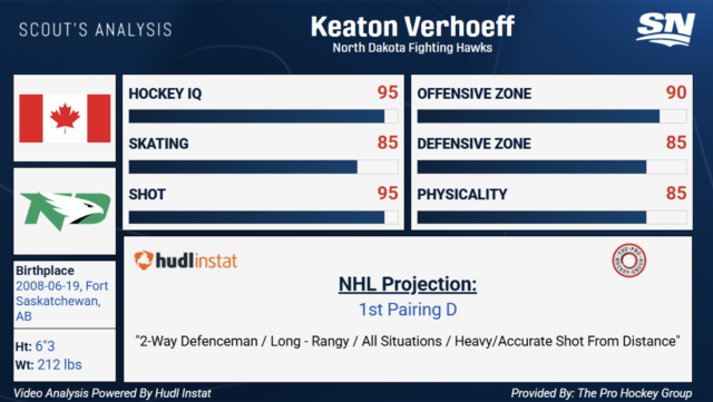 Verhoeff è stato al vertice della classe draft per tutta la stagione. Ha avuto un anno solido giocando per il North Dakota a livello NCAA. Il difensore a doppio senso ha l’abilità di fare da quarterback un gioco di potere e battere i portieri dalla lunga distanza con un tiro duro e preciso. Verhoeff ha prodotto 6G-14A in 36 partite della stagione regolare per i Preventing Hawks. L’anno precedente ha contribuito con 21G-24A alla WHL giocando per Victoria.
