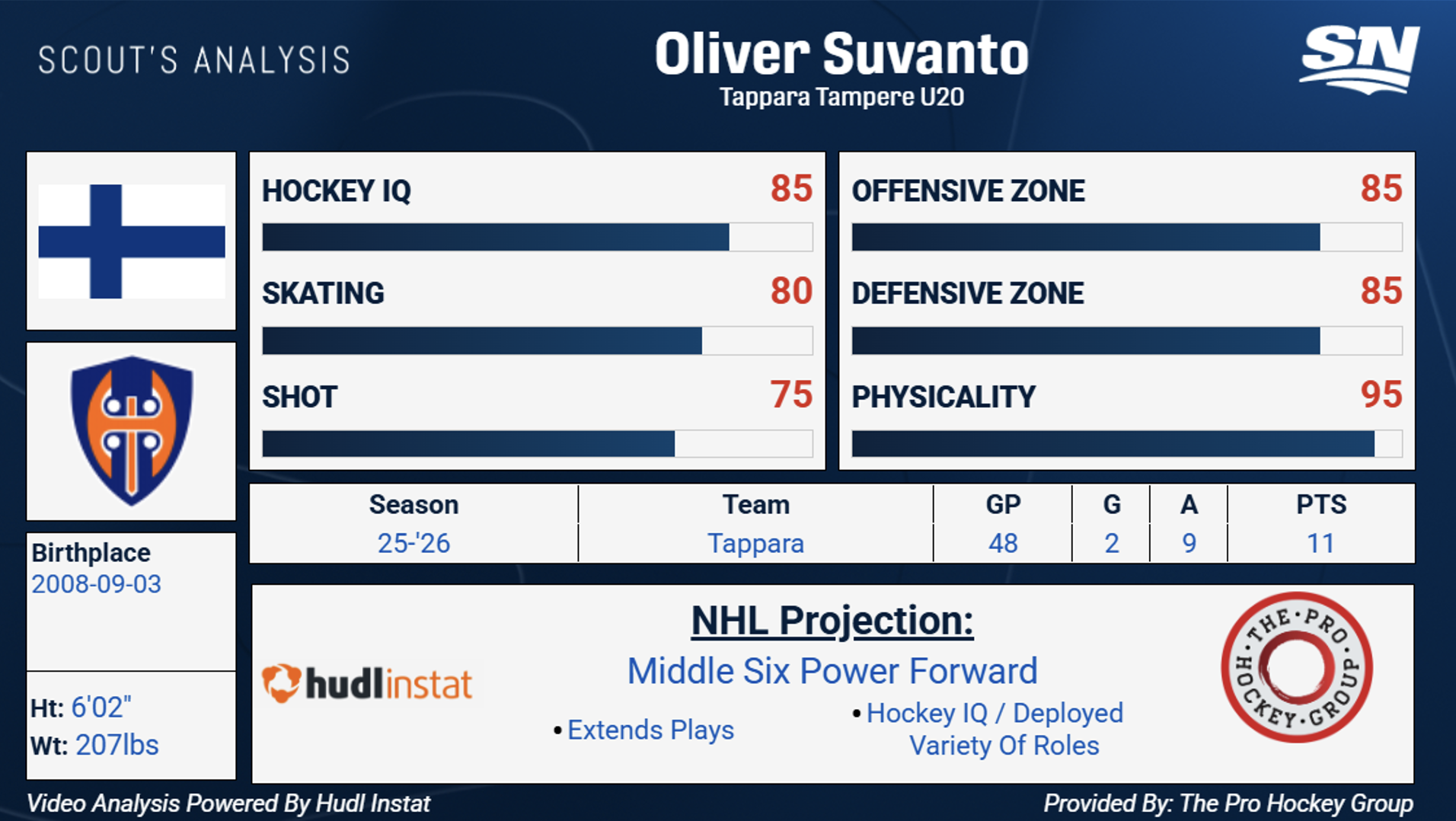 Oliver Suvanto, 6 piedi-2, 207 libbre, tiro in avanti sinistro, Tappara (U20)